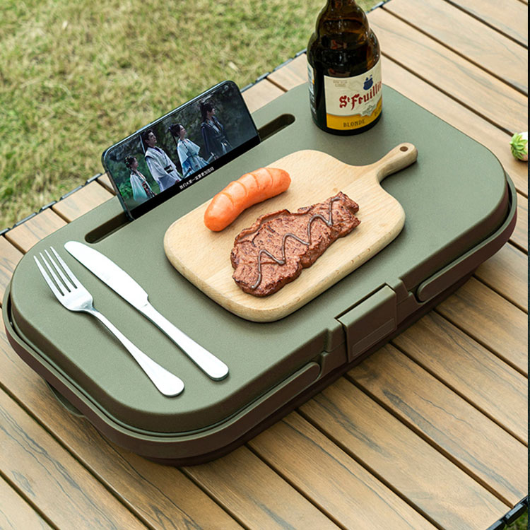 Deze innovatieve mand verandert in enkele seconden van een diepe opbergbak in een vlak, stabiel tafeloppervlak, waardoor zowel georganiseerde opbergruimte als een handig serveer-/eetplatform voor buitenactiviteiten ontstaat.
