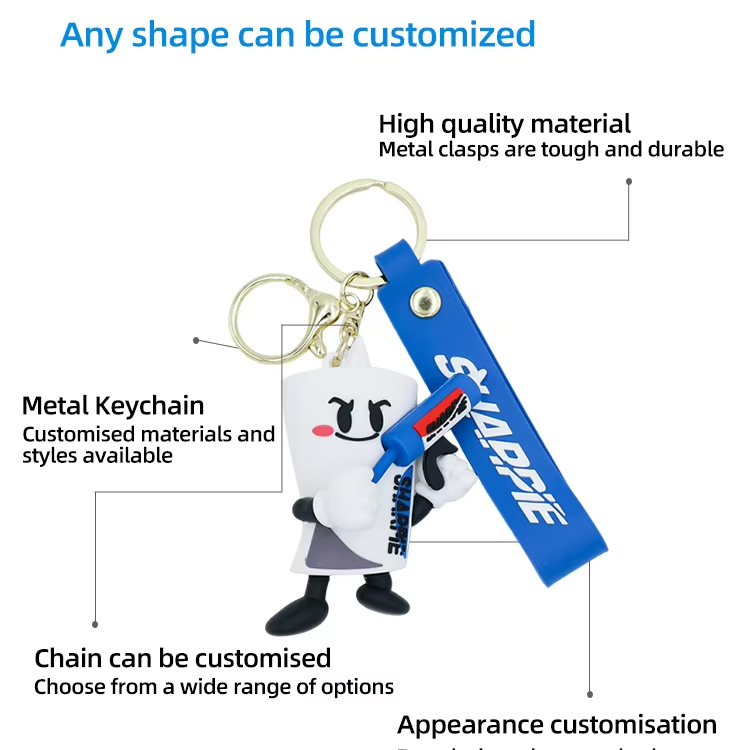 Breng uw merk of idee tot leven met volledig op maat gemaakte 2D- of 3D-ontwerpen. Of het nu een logo, mascotte of slogan is, onze zachte PVC-sleutelhangers zijn op maat gemaakt om bij uw visie te passen met levendige kleuren en hoge details.