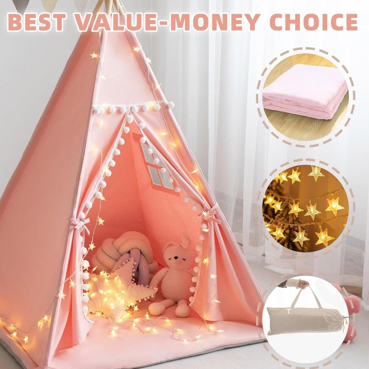 Katoenen canvas speelhuisje kinderen tipi tent voor kinderen met mat. Uw ultieme magische speelruimte voor creatieve avonturen. Deze tipi-tent van katoenen canvas is voorzien van een comfortabele mat, betoverende sterrenlichten en een handige draagtas. Perfect voor het stimuleren van fantasierijk spel en het creëren van blijvende jeugdherinneringen.