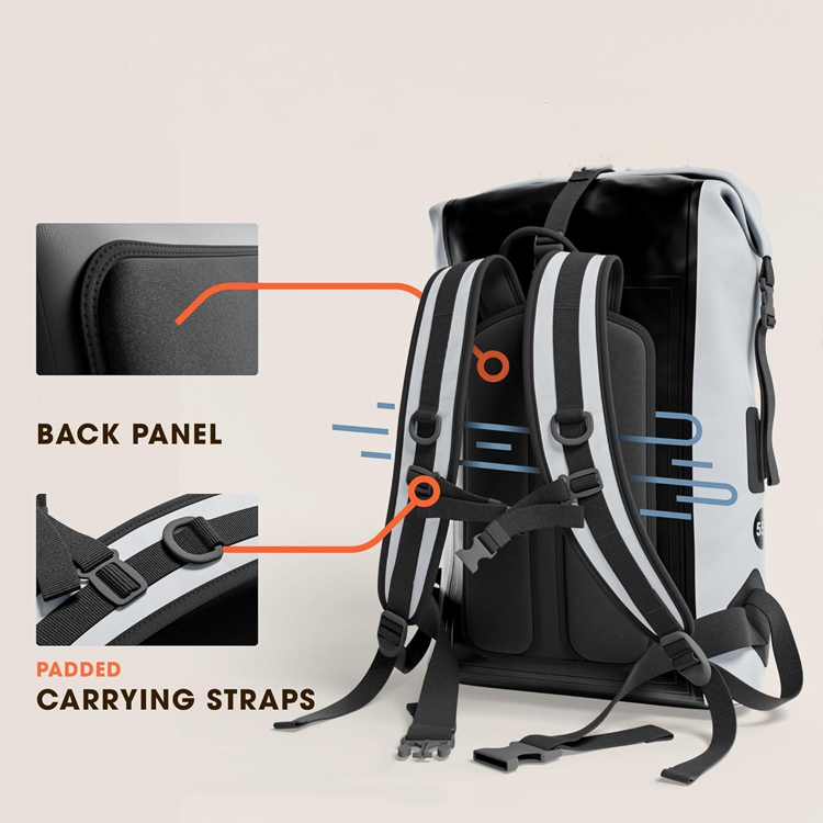 Inclusief comfortabele gevoerde schouderriem, meerdere handvatten en externe compressieriemen voor veilige bevestiging aan rugzakken of waterscooters tijdens actieve bewegingen.