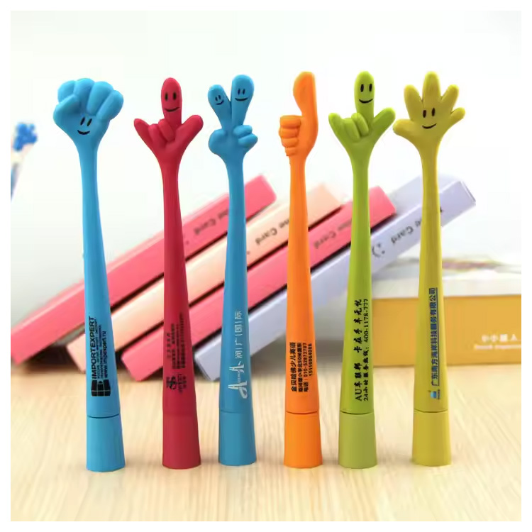 Leuke en mooie aangepaste logo bedrukte 1,0 mm plastic balpen。Leuke en kleurrijke vingervormige balpen met aangepaste logoprint. Een creatief 1,0 mm schrijfhulpmiddel, perfect voor kinderen, promoties, feesten of schoolcadeaus. Duurzame plastic behuizing, soepele inktstroom en een schattig ontwerp waar iedereen dol op zal zijn.