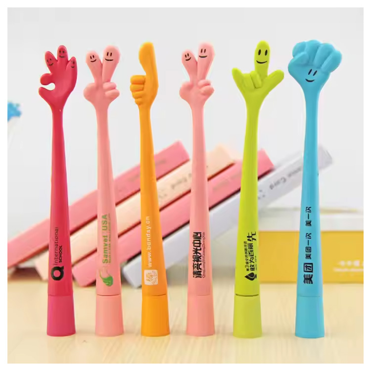Leuke en mooie aangepaste logo bedrukte 1,0 mm plastic balpen. Leuke en kleurrijke vingervormige balpen met aangepaste logo-afdruk. Een creatief 1,0 mm schrijfhulpmiddel, perfect voor kinderen, promoties, feesten of schoolcadeaus. Duurzame plastic behuizing, soepele inktstroom en een schattig ontwerp waar iedereen dol op zal zijn.