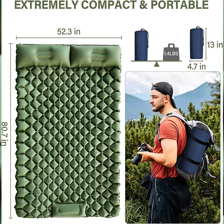 Dubbelpersoons campingslaapmatje Opblaasbaar kampeermatje. Ultiem dubbel comfort voor buitenavonturen. Dit opblaasbare kampeerkussen voor twee personen biedt ruime slaapruimte met een innovatief voetbevestigend ontwerp om uitglijden te voorkomen. Als ultralichte oplossing biedt het ongeëvenaarde draagbaarheid en gedeeld comfort voor kampeerkoppels en vrienden.