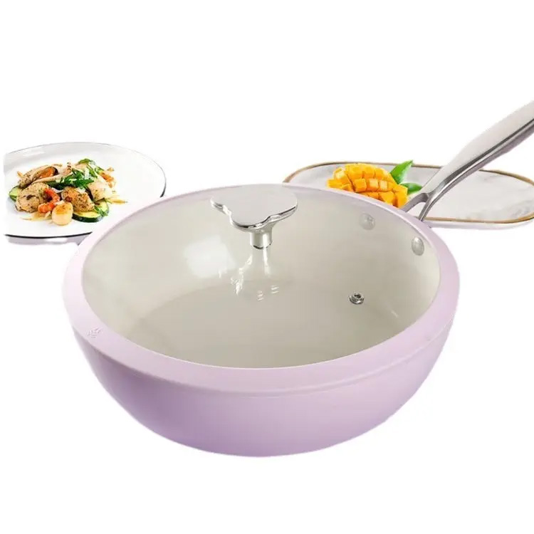 Lavendel shell porselein wok cobblestone keramische koekenpan. Gemaakt met elegantie, deze 28 cm lavendel shell porselein wok combineert keramische geplaveide textuur met anti-stick-prestaties. Geschikt voor alle fornuizen, is het ideaal voor dagelijks koken en stijlvol genoeg om te schenken - zowel schoonheid als functie naar je keuken brengen.