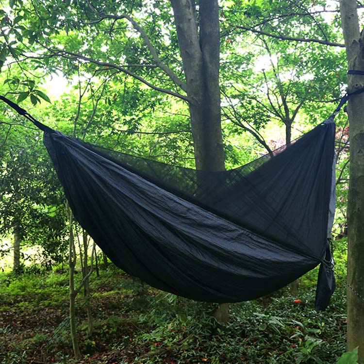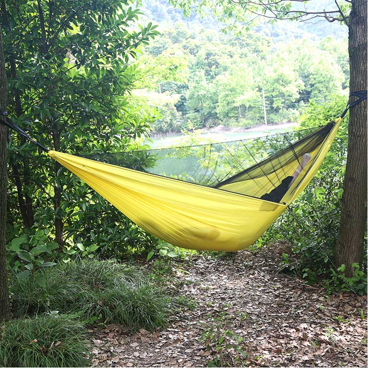 Beschikt over een 210T polyester klamboe met versterkte randen en een 70D nylon hangmatlichaam, waardoor de perfecte balans ontstaat tussen ademende insectenbescherming en duurzaam draagvermogen.