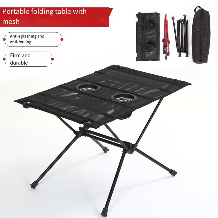 Ultralichte campingtafel Nylon ademend mesh opvouwbare tafel. Uw ultieme draagbare tafeloplossing voor buitenavonturen. Deze ultralichte kampeertafel heeft een duurzame nylon constructie met ademend mesh-oppervlak en geïntegreerde bekerhouder. Het opvouwbare ontwerp zorgt voor maximale draagbaarheid voor al uw buitenactiviteiten.