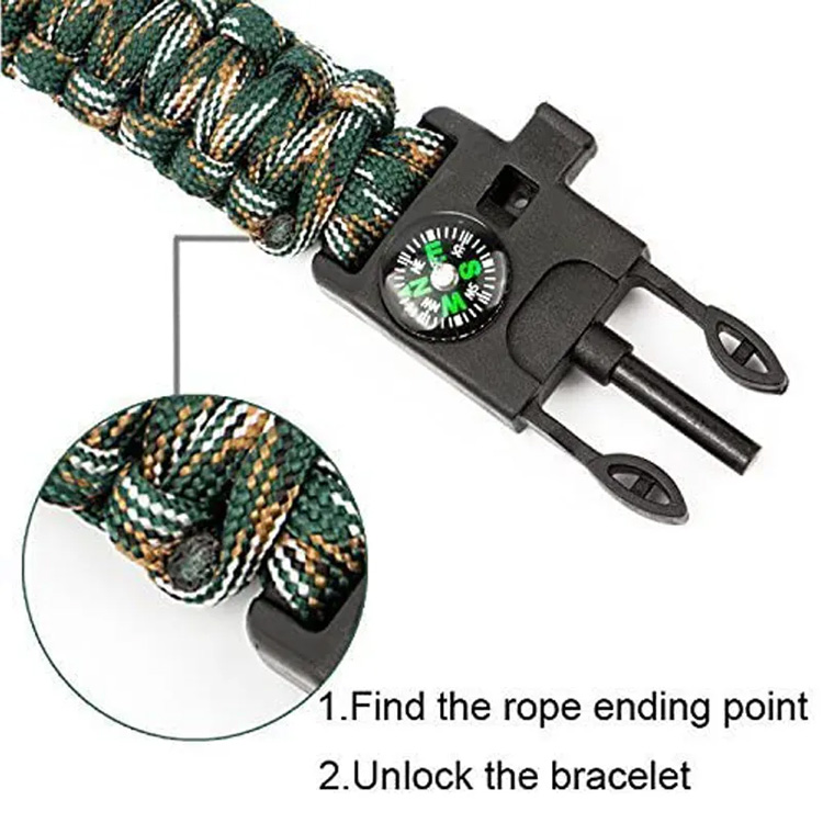 Het paracord kan worden ontrafeld om een noodtouw te maken voor het bouwen van schuilplaatsen, het repareren van uitrusting, EHBO-scenario's en talloze andere overlevingsbehoeften in wildernisomgevingen.